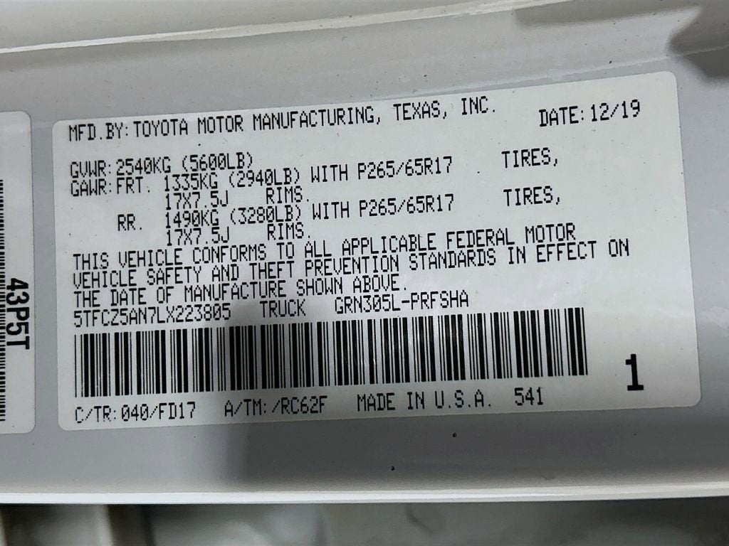 4WD, 120V/400W Deck Mounted AC Power, Blind Spot Monitor w/Rear Cross Traffic Alert, Color-Keyed Overfenders, Engine Immobilizer, Power Sliding Rear Window w/Privacy Glass, Technology Package, TRD Sport Package.